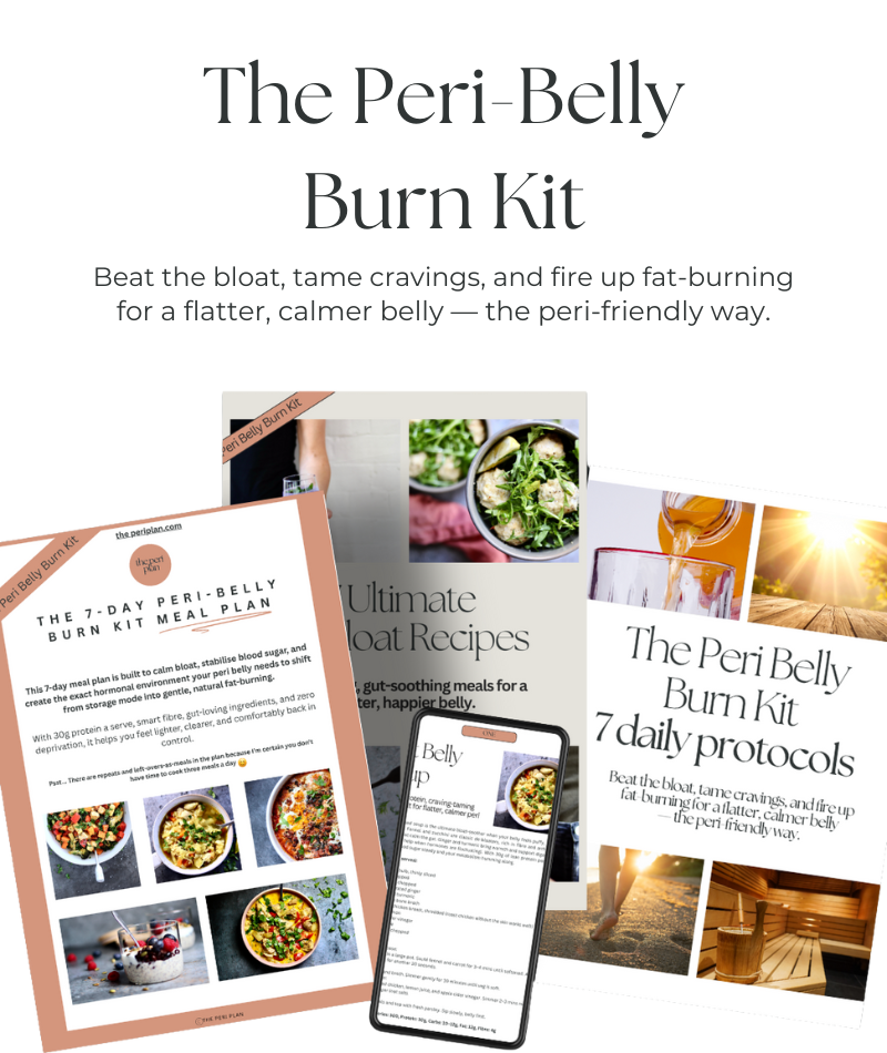 The Peri-Belly Burn Kit offers simple solutions to help reduce bloating and support steadier eating during perimenopause. It includes a clear meal plan, targeted recipes, daily protocols, and practical tools you can reuse as needed, so you know what to focus on each day without overthinking or guesswork.