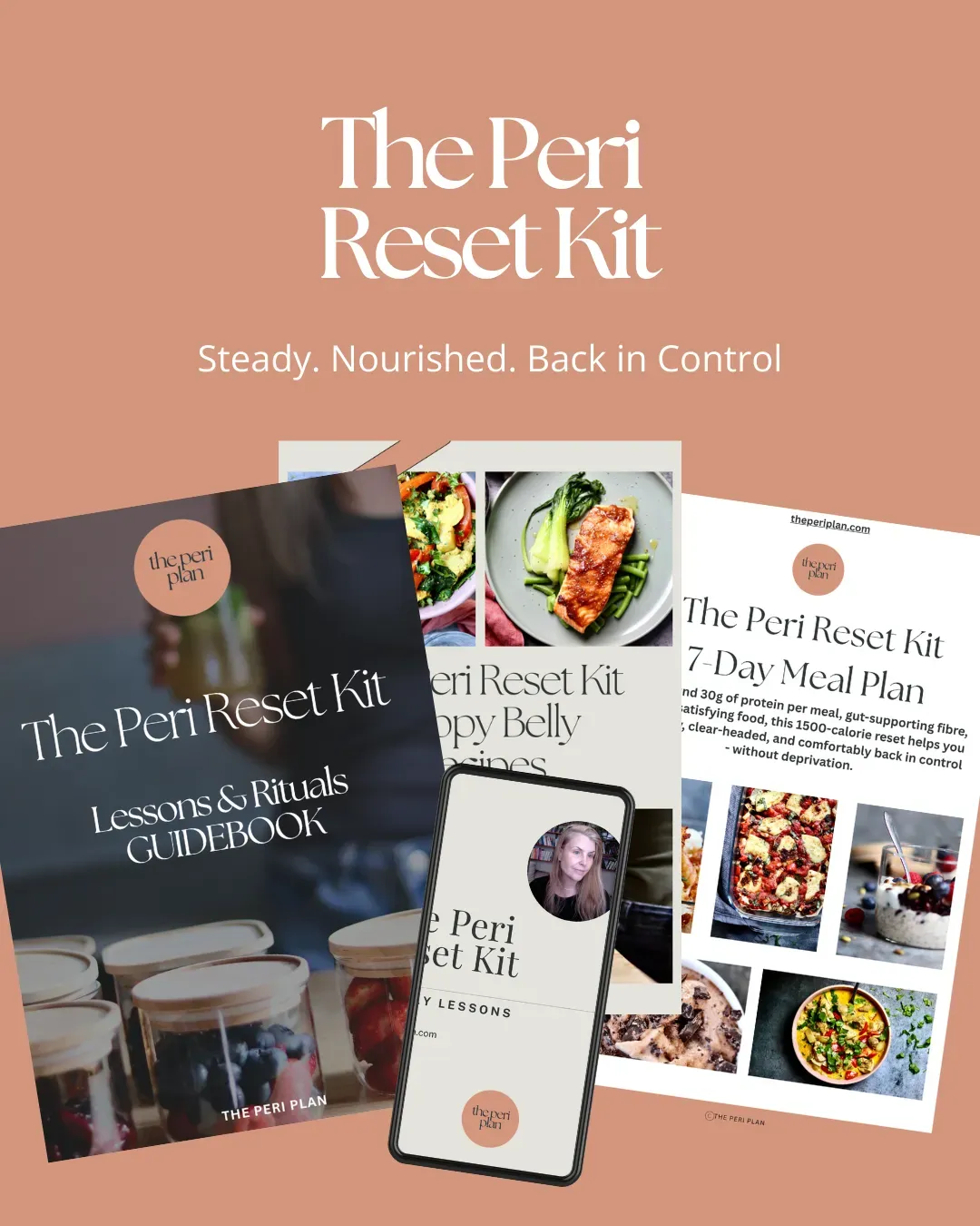 The Peri Reset kit is a simple, supportive reset to ease bloating, calm cravings, and help you feel like yourself again without restriction, overwhelm, or starting over.